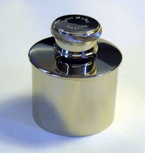 Oil bottle with dipper in bright nickel plate. Dia. 1.6" (40.60mm).Also in polished brass. Can be stamped with gunmaker name (Trade only). |