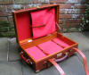 The inside is fitted in Crimson Alcantara (a very high quality, made made suede). There are two securing straps for overnight clothes etc. In the lid is a pouch to hold a laptop.