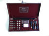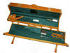 Set comprised of 4 turnscrews, 2 cleaning rods (12b and .410), 5 pairs of snap caps (12,16,20,28,410), a chamber brush handle to match the turnscrews with brushes and covers for all the above chamber sizes. In a comparment under the turnscrews are all the jags, mops and brushes for the cleaning rods. A box of patches and tin of oil complete the set.
