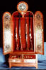 A very unusual display cabinet for shotguns, rifles, pistols and knives. The doors and top have coloured, antique glass sandwiched between laser cut brass, gold plated panels. There are low voltage downlighters to display the guns when the doors are open. The lights also give a beautifull subdued glow through the glass when the doors are closed.
