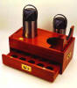 A cabinet made from solid Mahogany, to hold 10 fine china cups. The top contains two pump action vacuum flasks which could be used for either hot or cold drinks.